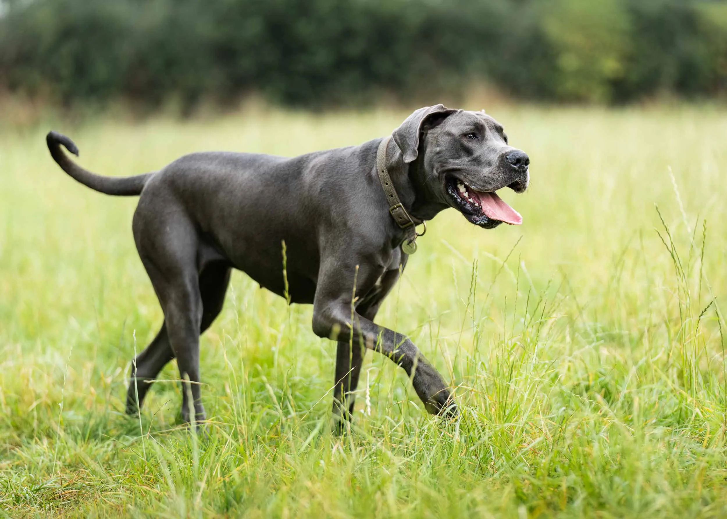 A great dane wanders through a meadow near Harrogate during a dog photography session