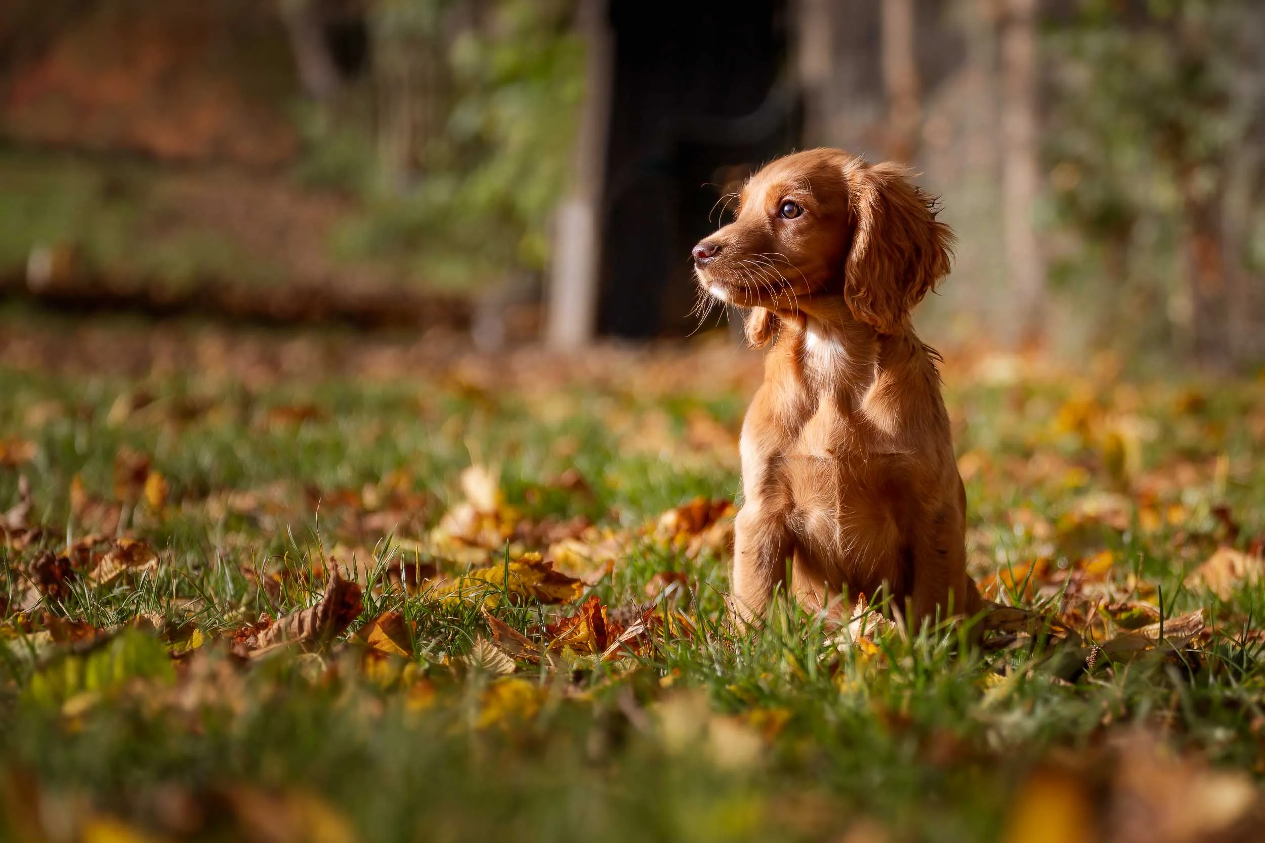 A cocker spaniel puppy sits among autumnal leaves during a pet portrait session near Ilkley, West Yorkshire