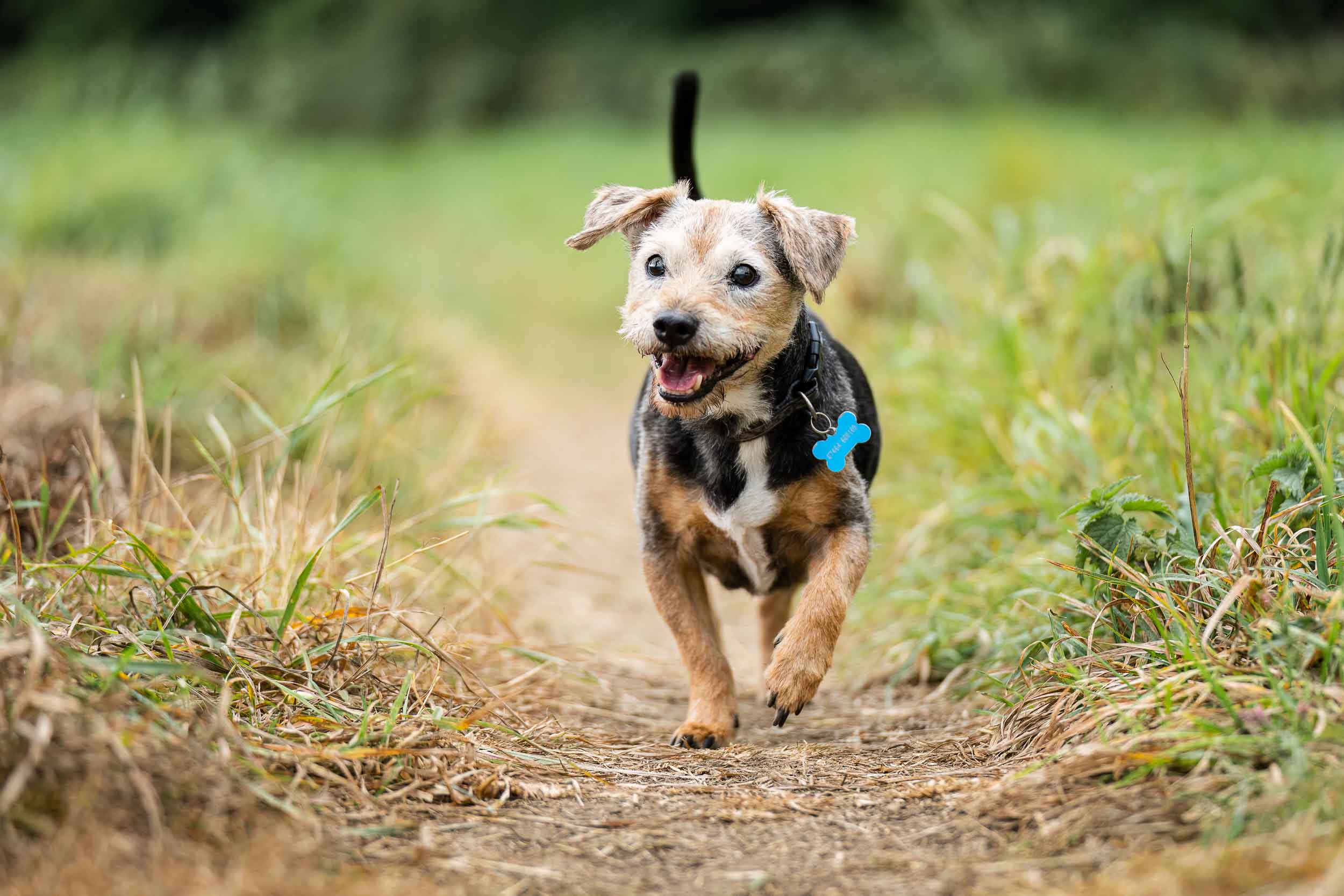 A sprightly, old border terrier cross trotting along a track during a dog photography session on the edge of Harrogate, North Yorkshire