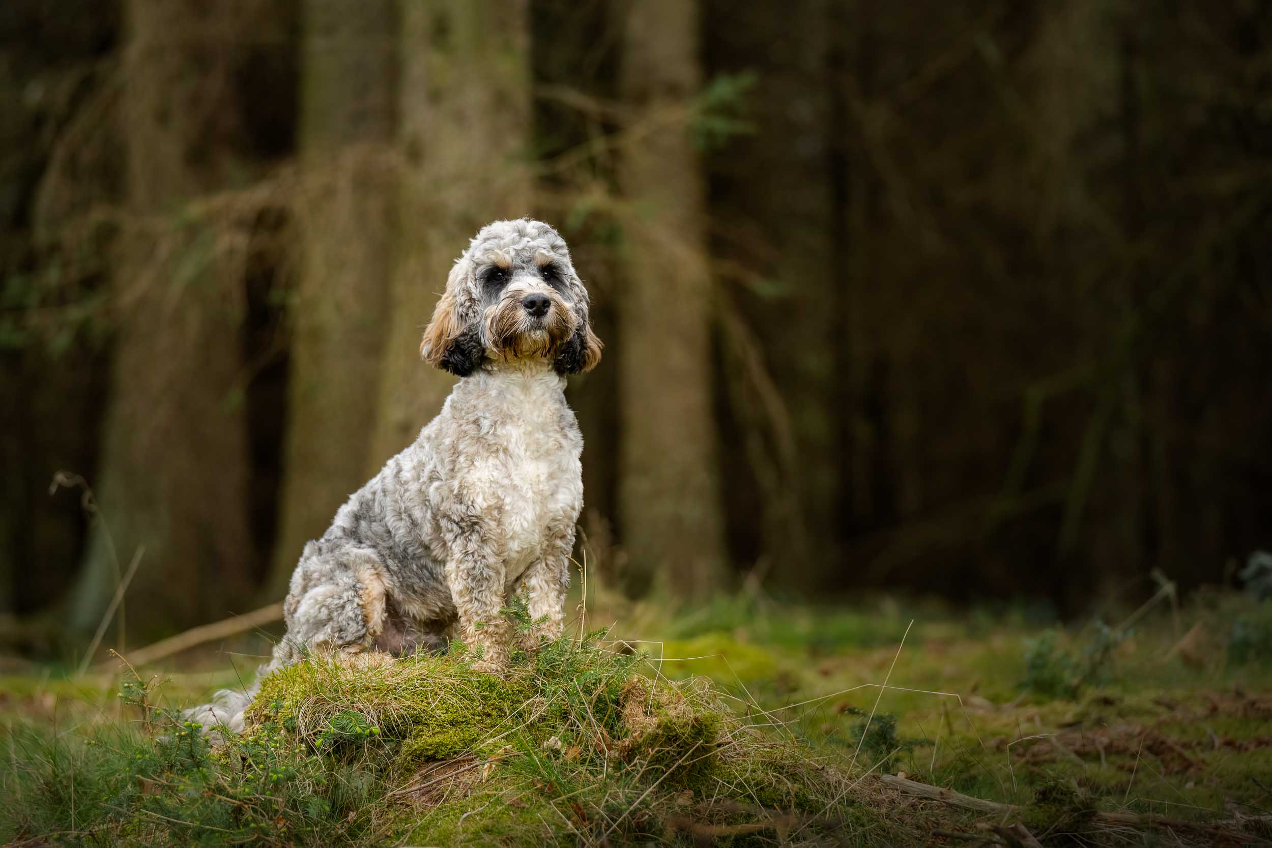 A dog photography portrait of a cockapoo sat on a tree stump in woodland located between Otley and Harroagte, Yorkshire