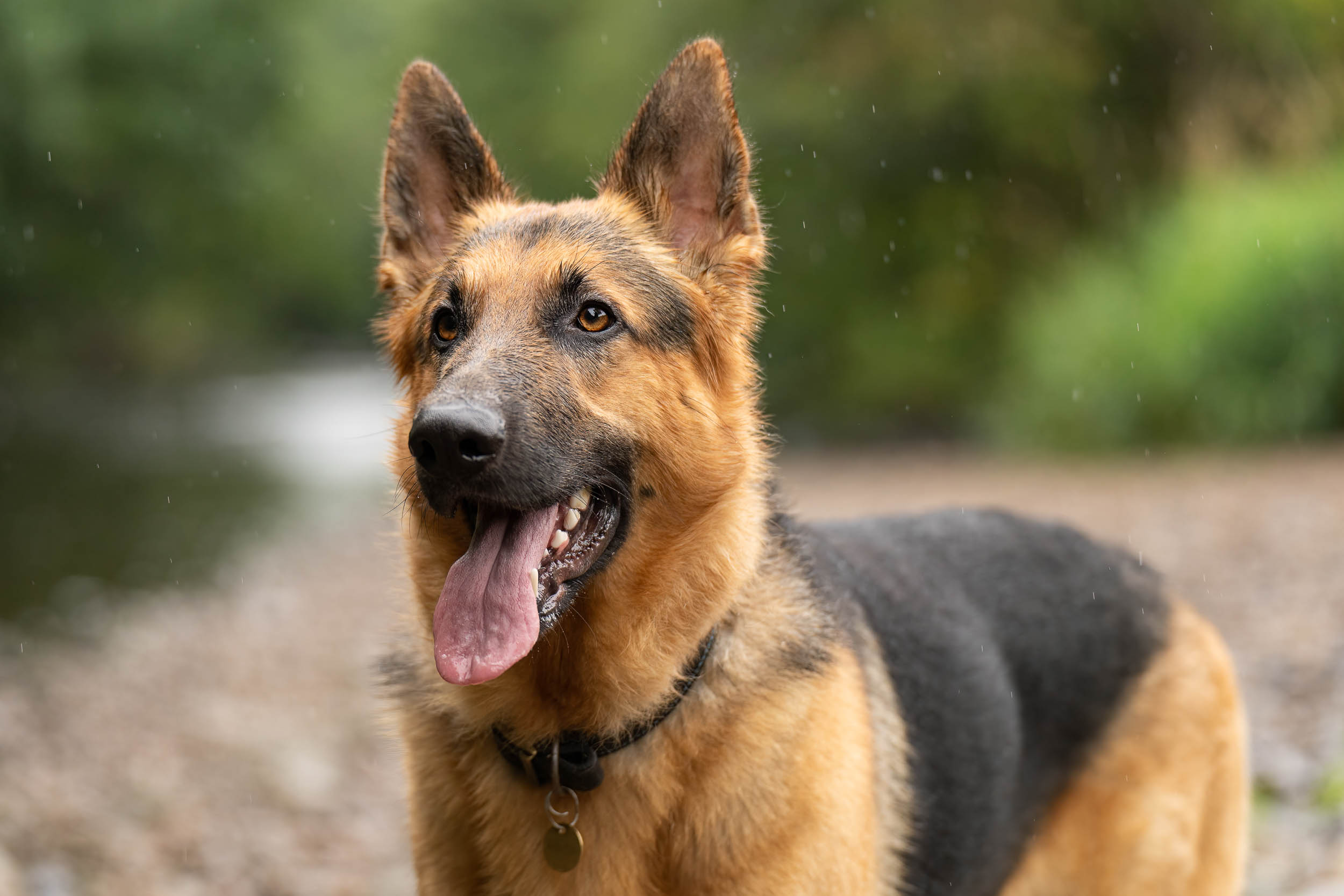On rainy day in Nidderdale, near Harrogate, a German shepherd pauses as it’s portrait is taken during a dog photography session.