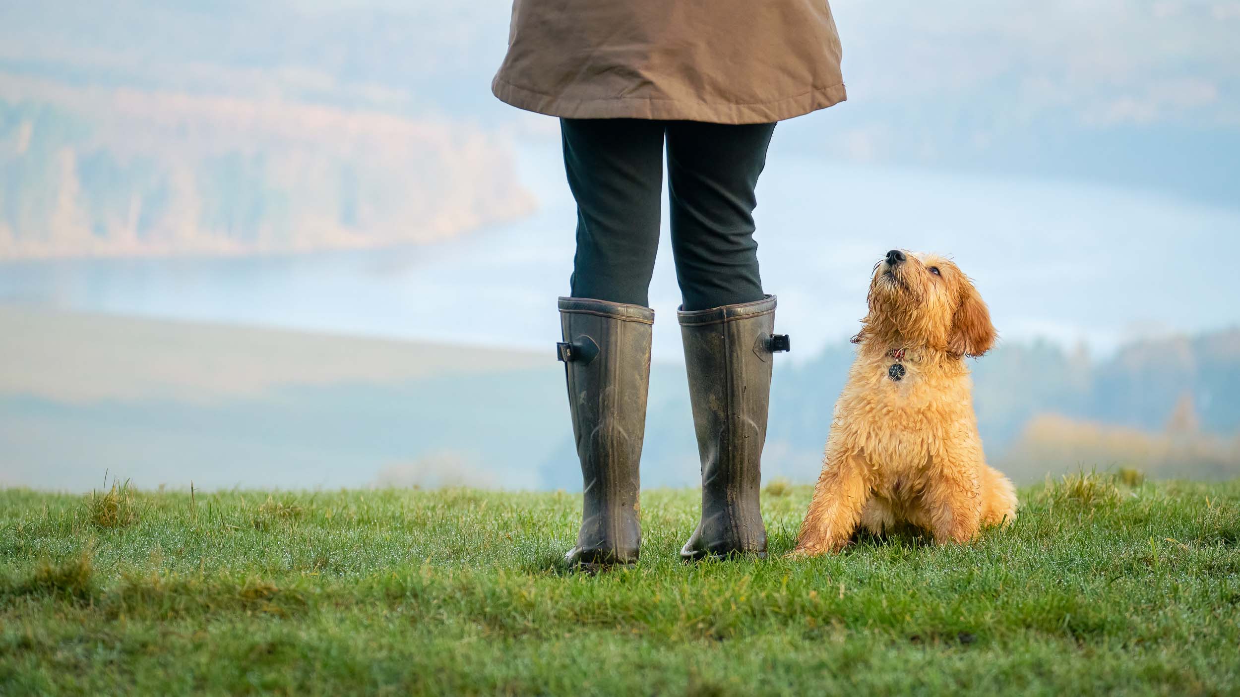 A puppy pictured next to it’s owner during a dog portrait session in meadows overlooking the Washburn Valley, near Otley, West Yorkshire.