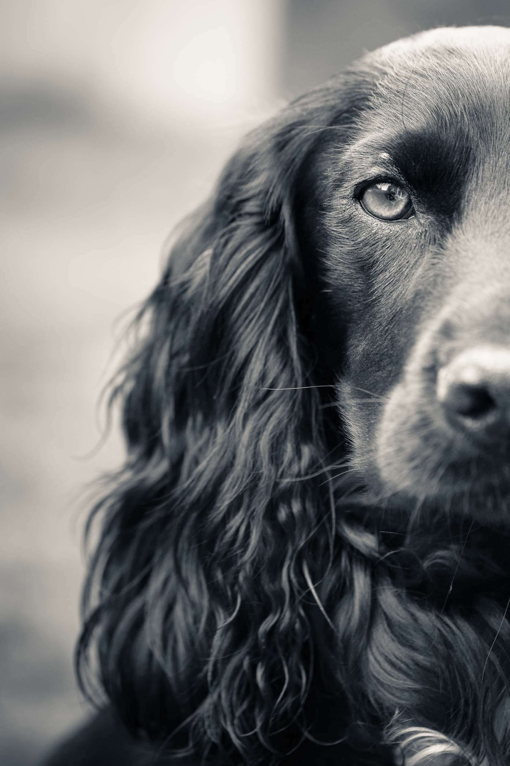 A close-up portrait of a beautiful black cocker spaniel captured during a dog photography session at a home near Leeds, West Yorkshire.