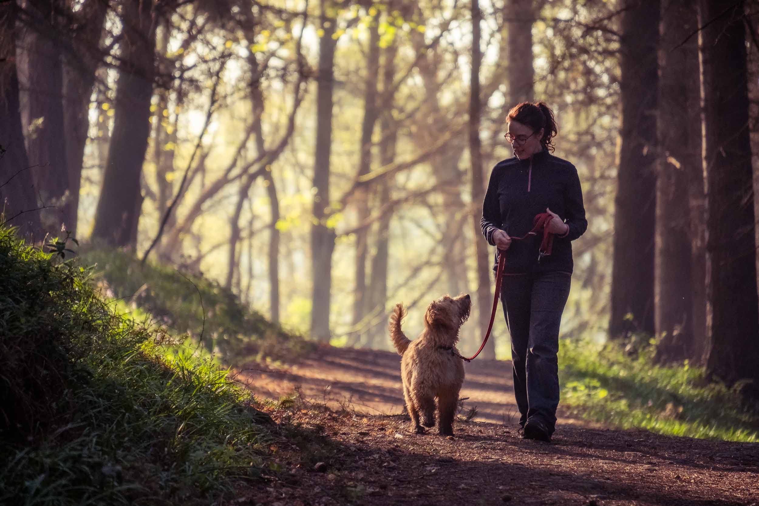 A pet portrait of a dog and their owner going for a walk along a woodland track near Harrogate