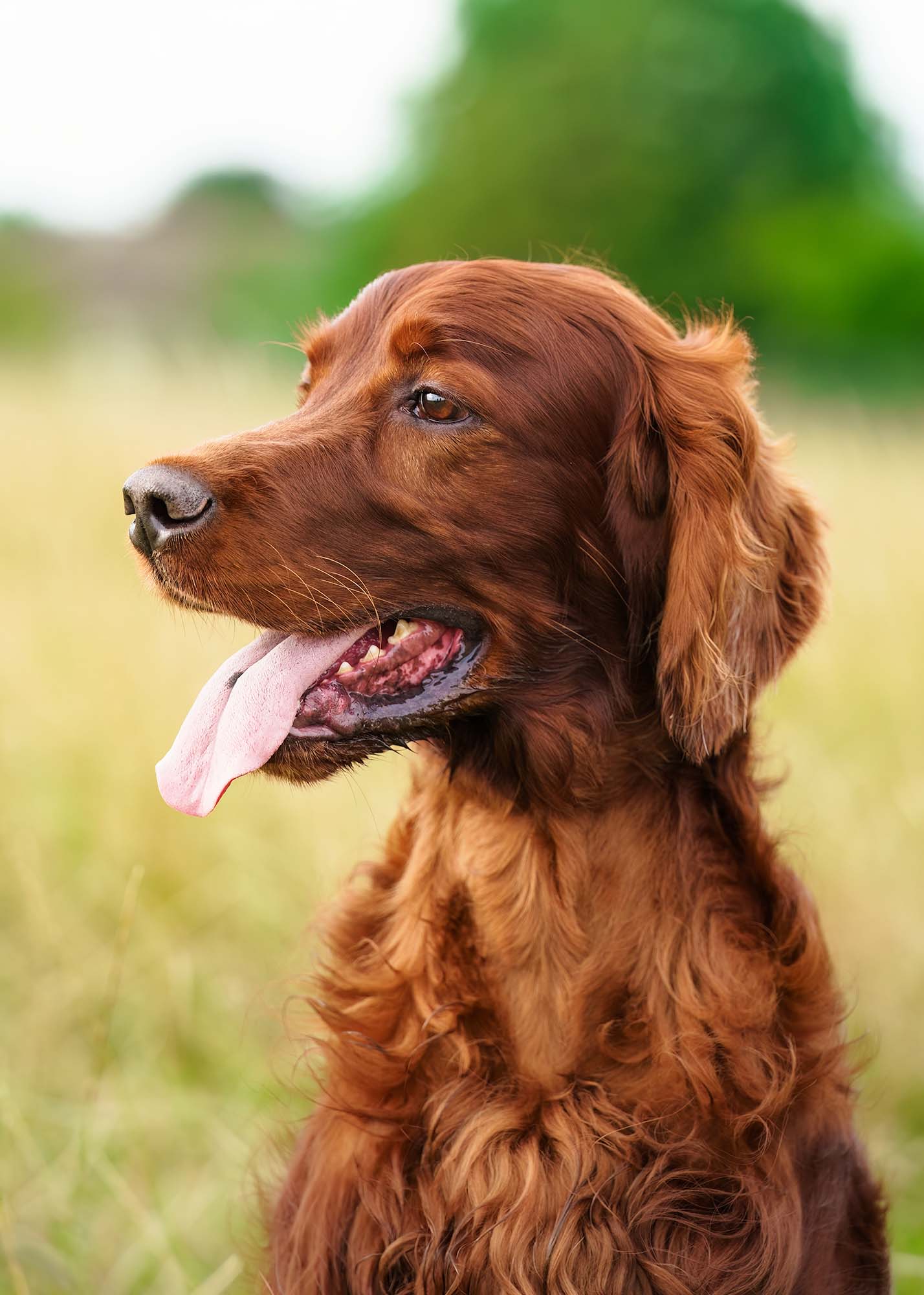 A stunning Irish Setter pauses for a close up portrait. This photo session took place in a secure dog field on the outskirts of Leeds. As we had many dogs at the photo session we thought it would be safer and more relaxed in a secure space. If you would feel more comfortable having your photo session at a dog park we are more than happy to do that. The way in which we shoot and retouch the images can often hide distracting backgrounds such as fences. We have access to a selection of fields around the region that we can recommend. Please be aware that there is an additional charge for the hiring of secure fields.