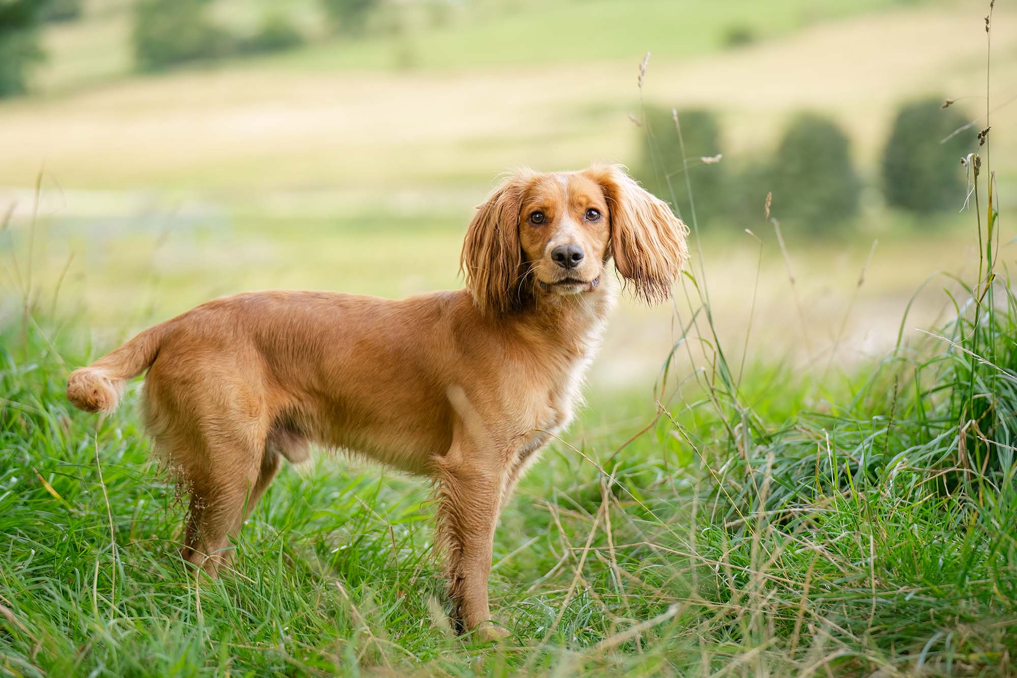 We had the pleasure of photographing this spirited Working Cocker Spaniel puppy amidst the scenic beauty of the Washburn Valley, nestled on the fringes of the captivating Yorkshire Dales and conveniently close to Harrogate and Otley. During the photo session, given the puppy’s boundless energy typical of the Cocker Spaniel breed, we used a lead for posed photographs like this one. Thanks to our retouching expertise, we seamlessly removed the lead from the final image.