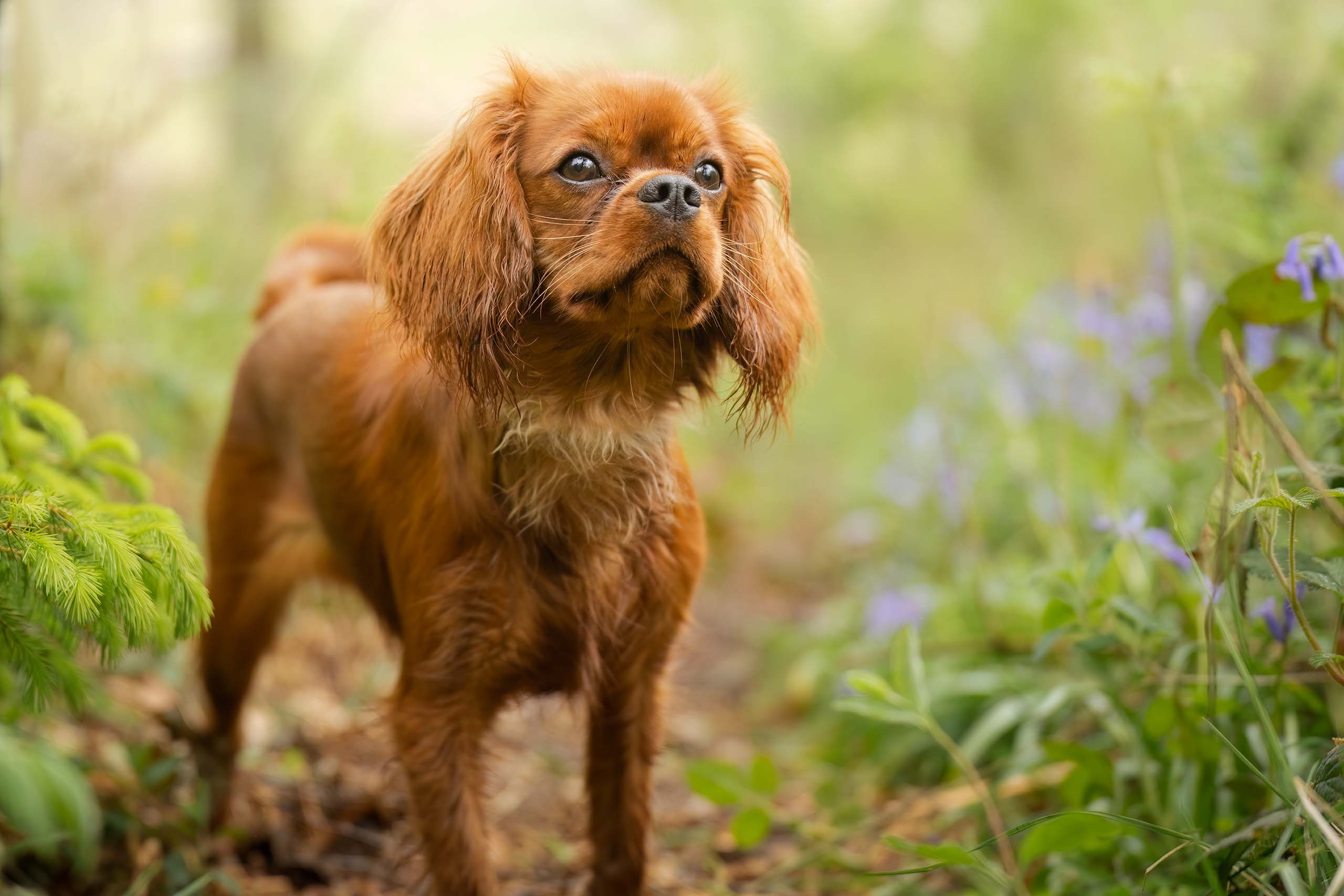Lovely spring photo session among the bluebells in woodland near York and on the edge of the North York Moors. This Cavalier King Charles Spaniel puppy was only a few months old when we met. In order to ensure she was safe for the duration of the Photo Session she was kept on and extendible lead. If due to problems with recall or reactivity of your dog you feel that you would prefer not to let them off lead during the shoot that is no problem. We can use techniques during the photo session and in post processing that make it possible to remove both leads and collars from the final photos.