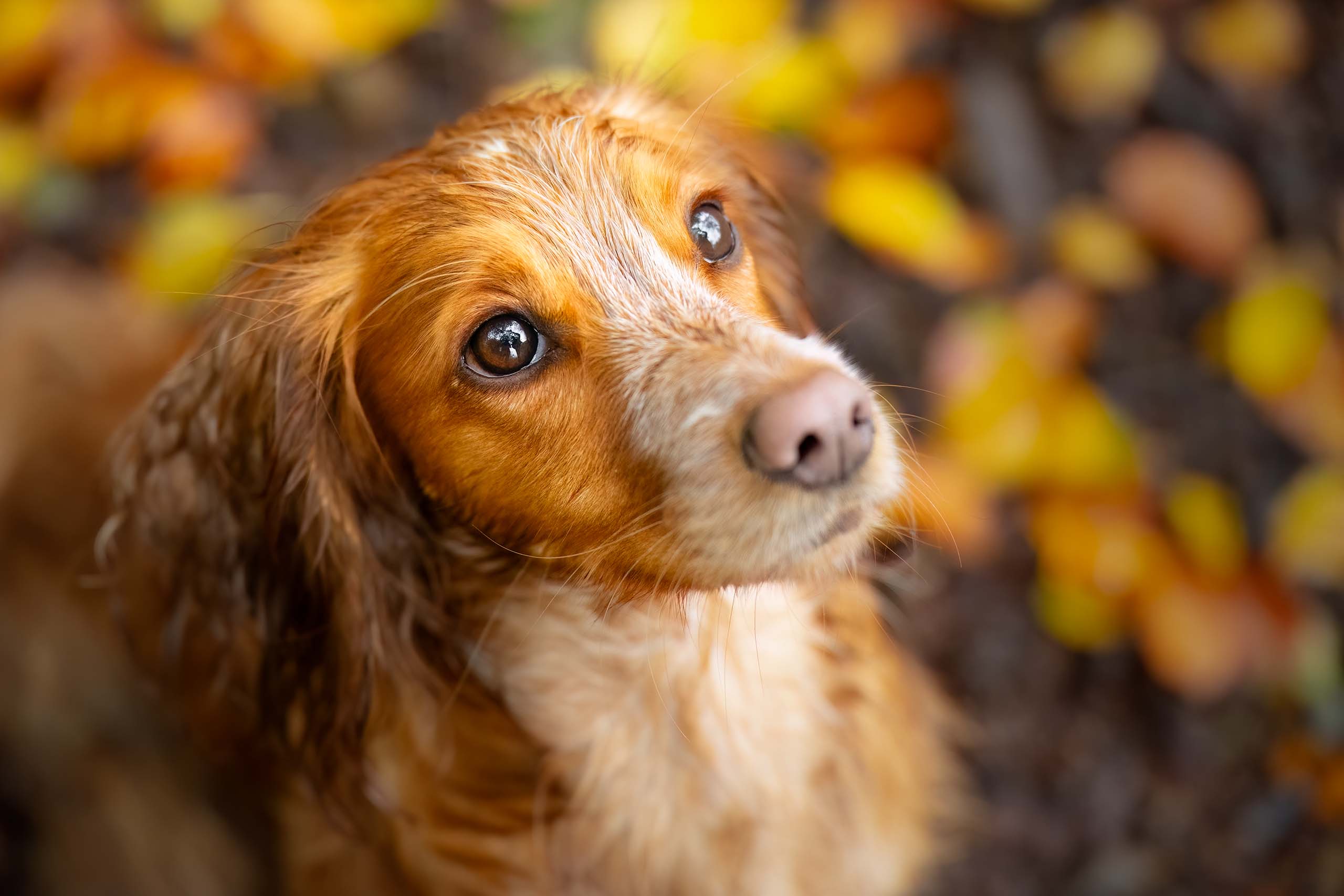 On a day where flooding from heavy rain had almost stopped us from getting to our shoot location, a brief dry spell allowed us to have an autumnal photo session for this very patient and well behaved cocker spaniel in beautiful mixed woodlands near York. The amber tones of the dog blended beautifully with the colours of the surroundings allowing us to capture a beautiful selection images before the rains returned.
